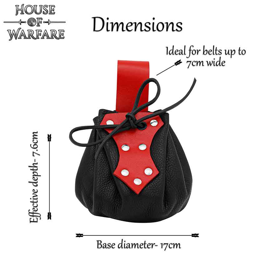 This striking black and red leather drawstring belt pouch is handcrafted of soft, high-quality genuine leather and studded with steel rivets. Its compact size and convenient functionality allows you to carry essentials like coins or other small items at festivals, fairs, and reenactment events
