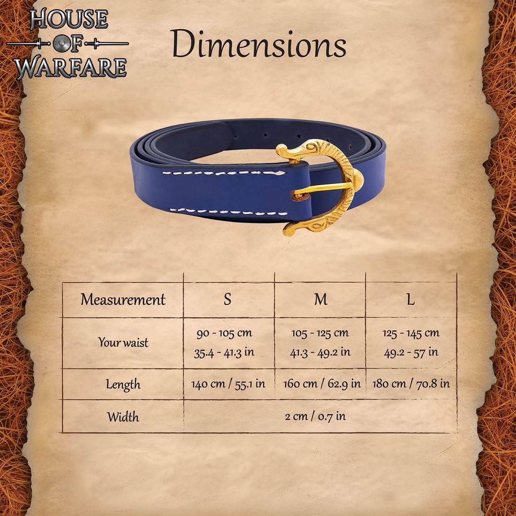 A blue leather belt with an animal-shaped brass buckle suitable for almost any time from the early Middle Ages through to the Renaissance, but especially suited to the Anglo-Saxon, Viking, and early Norman periods