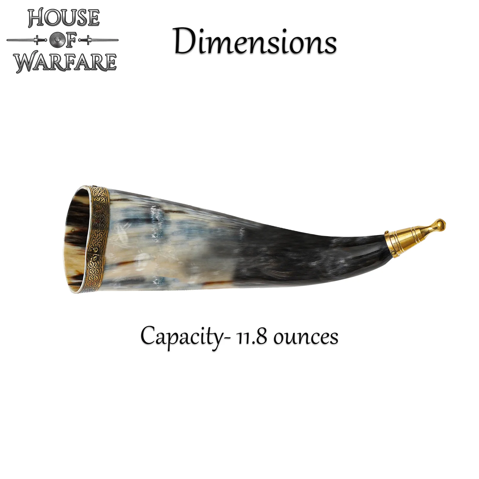 This handcrafted, genuine ox horn features a pure brass rim etched with Celtic knot designs and a tip with a solid finial