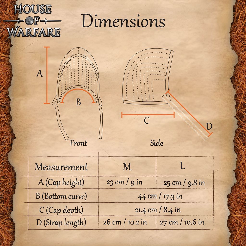 The cap is equipped with secure side ties that fasten beneath the chin, ensuring it stays in place even during vigorous activity. Its close-fitting cut keeps it snug to the head, helping to stabilize helmets and prevent shifting during combat or sparring. Reinforced stitching across the seams and crown adds extra strength for long-lasting use. Its slim profile fits comfortably under a wide range of medieval helmets, including great helms, kettle hats, bascinets, and nasal helms